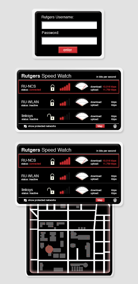 Wifi Widget 2008 / widget design Not an actual widget, but the visual design for one that allows Rutgers students to easily find and access wifi hotspots.